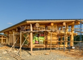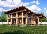Элементы силового каркаса имеют декоративную функцию, расстановка элементов каркаса выполнена по конструктивной сетке, построенной по принципам композиции. Наружные стены между бревенчатыми несущими стойками каркаса заполняются брусом в горизонтальном направлении.