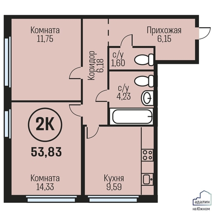 Общая площадь квартиры — 53.83 кв.м. Тип дома — монолит-кирпич. Компания-застройщик — Адалин.