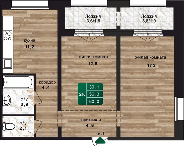 Общая площадь квартиры — 60 кв.м. Тип дома — панельный. Компания-застройщик — СОЮЗ.