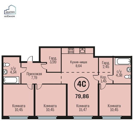 Общая площадь квартиры — 79.86 кв.м. Тип дома — монолит-кирпич. Компания-застройщик — Адалин.