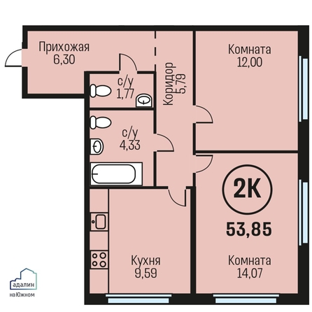 Общая площадь квартиры — 53.85 кв.м. Тип дома — монолит-кирпич. Компания-застройщик — Адалин.