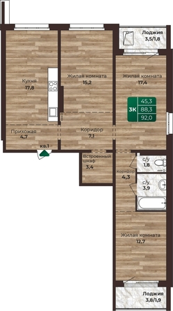Общая площадь квартиры — 92 кв.м. Тип дома — панельный. Компания-застройщик — СОЮЗ.