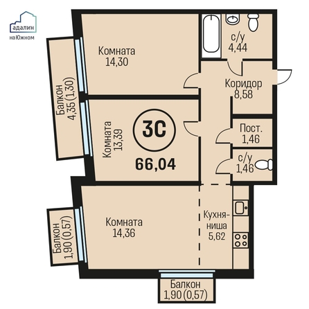 Общая площадь квартиры — 66.04 кв.м. Тип дома — монолит-кирпич. Компания-застройщик — Адалин.